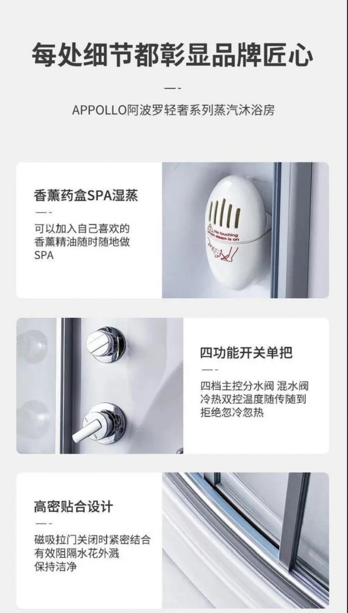 APPOLLO阿波羅蒸汽房不僅只有蒸汽功能,它還有淋浴、按摩等功能。頂落水淋浴花灑,超大頂噴,自動背部真空噴淋按摩,在蒸汽房中我們的皮膚受到高溫刺激從而毛孔張開,在高溫發汗排毒的同時將干凈的水蒸氣補充到深層肌膚達到持久的水嫩。蒸汽房還配有蒸汽香薰藥盒,將香薰精油或中藥包放入進而獲得事半功倍的效果。