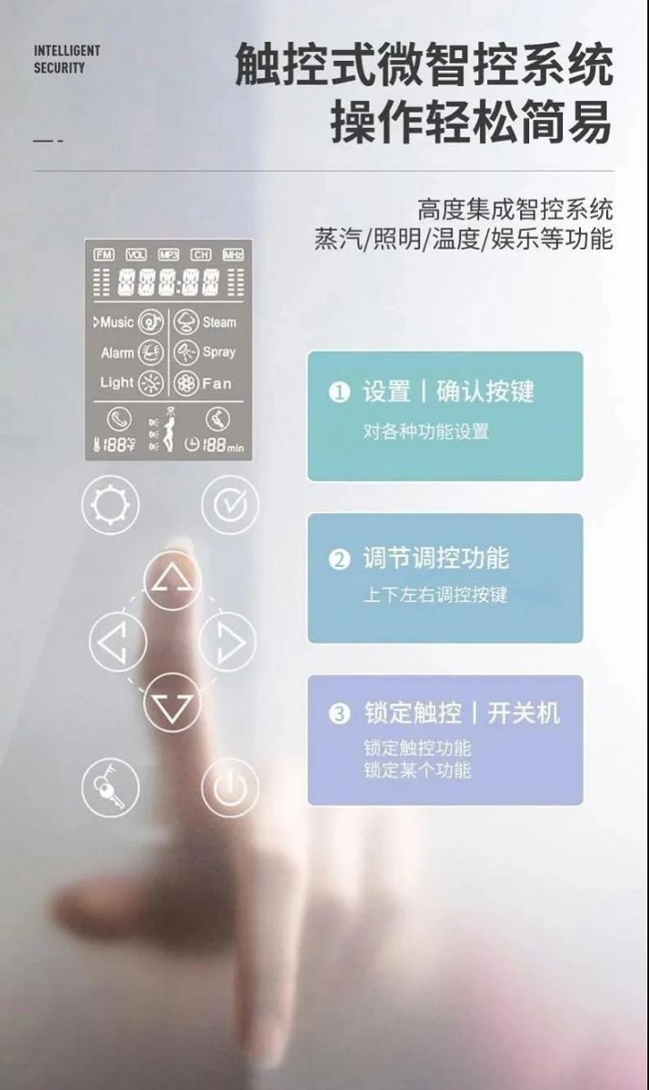 APPOLLO阿波羅蒸汽房內置FM、藍牙多媒體功能,沐浴的同時享受動聽的音樂,接聽電話,智能面板解放雙手,盡情享受沐浴的快樂。