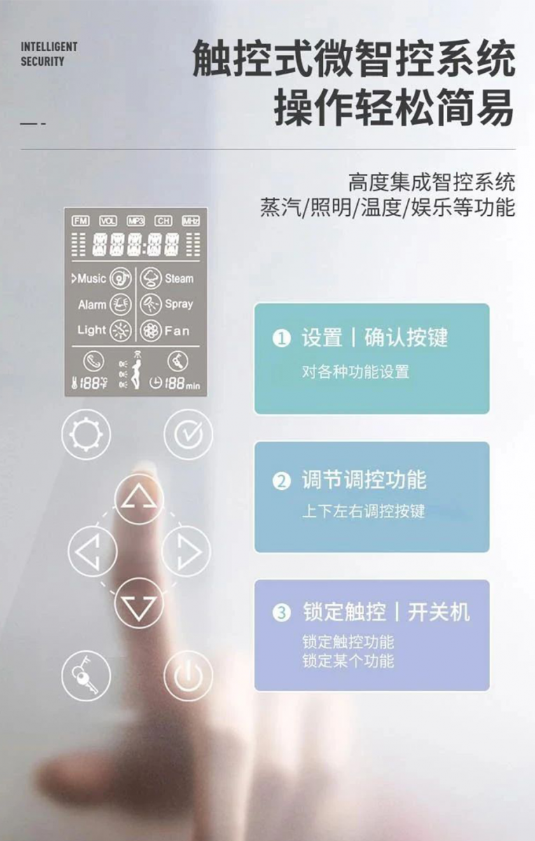 Appollo蒸汽房還內(nèi)置FM、藍牙多媒體功能,在沐浴的同時享受動聽的音樂,哼著喜歡的歌曲,心情都舒暢了呢~還能隨時接聽電話,智能面板解放雙手,不怕弄濕手機或手機進水霧,一邊和朋友聊天分享趣事一邊沐浴也不失一件快樂的事情。