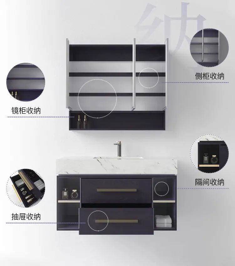 鏡柜+側柜+抽屜+隔間,鏡柜分為開放式和封閉式,開放式鏡柜空間大,可輕松收納漱口杯、牙膏、牙刷、潔面用品等,在日常洗漱時方便拿取,幸福感拉滿。封閉式鏡柜使用原木隔板分區,讓整個鏡柜充滿設計感的同時又能儲存多樣用品。