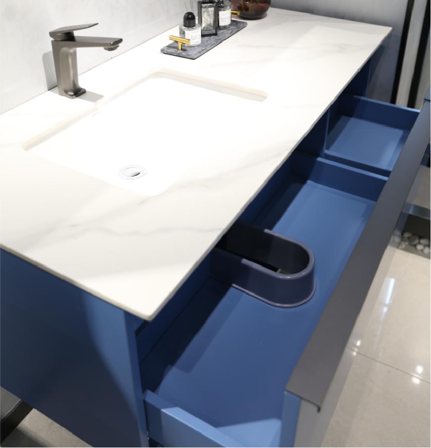 從主柜而言,多層實木貼橡膠木皮,精選具有高密質地堅硬的優質木材,針對浴室水汽多濕度大等特點量身定制,防潮防水防霉效果好;海棠藍明艷不俗,讓原本沉悶的浴室空間增添一抹亮色。