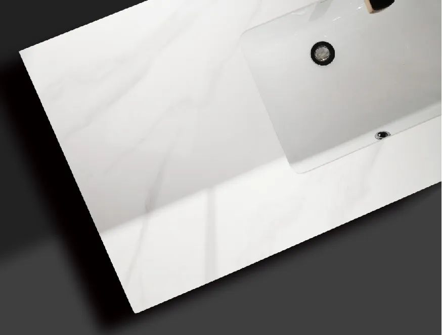 雪山石巖板臺面繼承大理石的硬度耐高溫時尚紋理的同時,又摒棄了大理石的厚重,經過1280℃高溫燒制,密度高,抗污抗菌效果好,污漬潑灑到臺面之后即可用抹布簡單擦拭干凈。內嵌式陶瓷洗手盆不容易濺水,邊緣沒有凸起,臺面積水也可直接掃到盆內清潔打掃很方便。