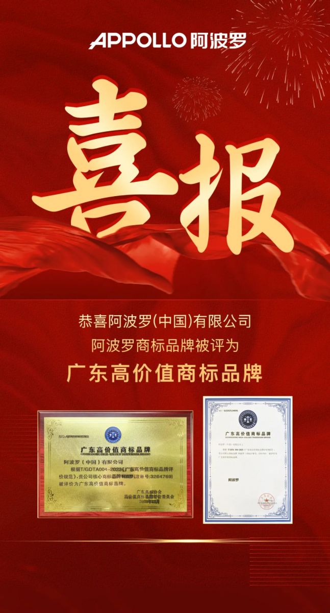 阿波羅榮獲“廣東高價值商標品牌”榮譽稱號