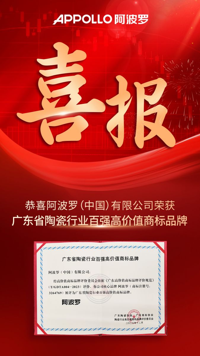 熱烈祝賀!阿波羅(中國)有限公司榮獲"廣東省陶瓷行業百強高價值商標品牌"