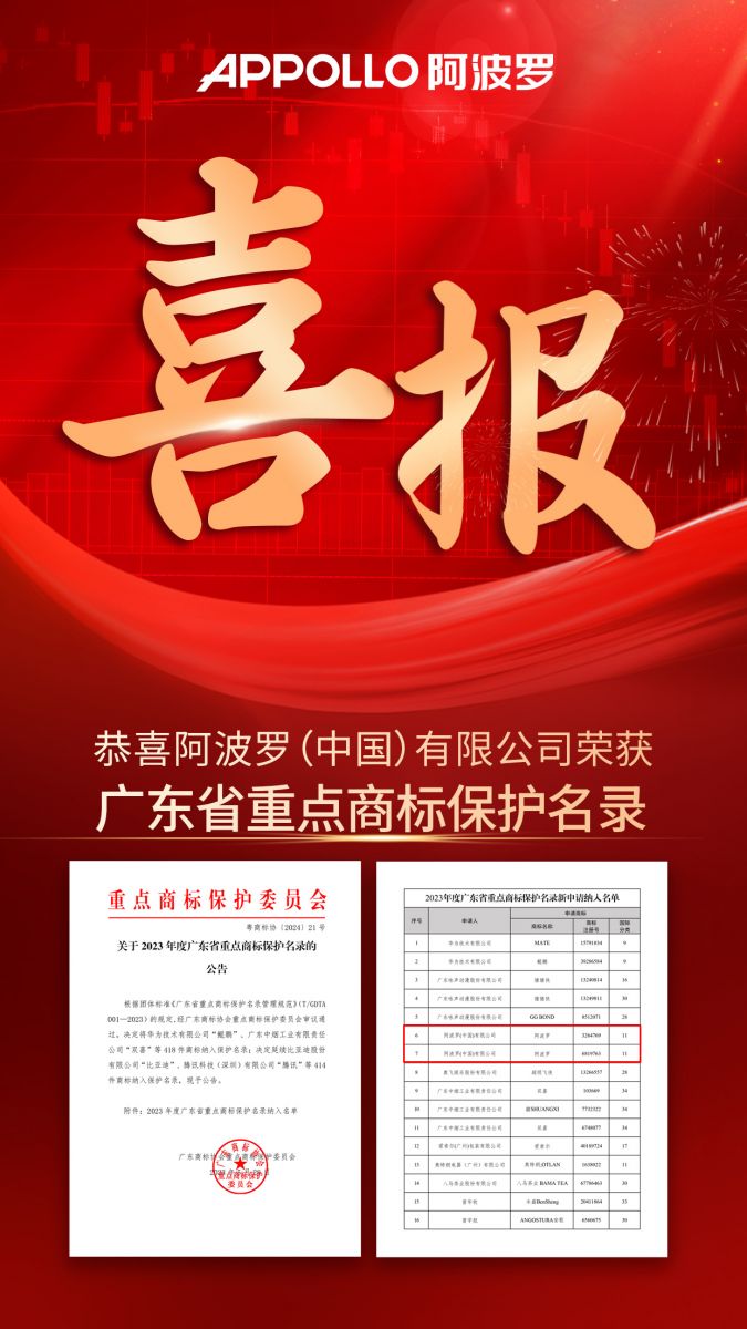 2024年5月28日,廣東商標協會重點商標保護委員會發布《關于2023年度廣東省重點商標保護名錄的公告》,審議通過將阿波羅(中國)有限公司“阿波羅”等共計418件商標納入廣東省重點商標保護名錄。